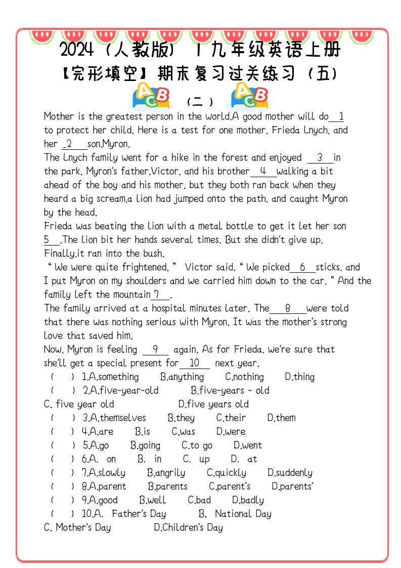 【2025秋新版】九年级英语上册:完形填空期末复习过关练习(5篇)许老师2025-10-16更新9447 🔥免费领取夸克网盘1TB空间 ——预览已结束,还剩9页未读——您已获得此文档下载权限,请点击底部下载完整文档 免费资源【2025秋新版】九年级英语上册:完形填空期末复习过关练习(5篇)可打印免费下载资源下载资源下载复制密码THE END九年级# 期末复习 点赞47 分享QQ空间微博QQ好友海报分享复制链接